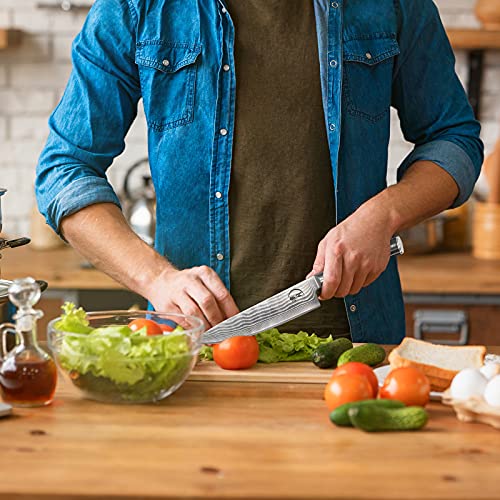 - Multipurpose chef's knife & beautiful pattern: This damascus chefs knife can easily meet all your daily kitchen needed such as chopping, slicing, dicing, and mincing meat, vegetables, fruits, and bread, and also cuts meat off bones. What's more, the damascus steel comes with a beautiful pattern on the blade, greatly increasing the aesthetics, and makes your knife unique and special.