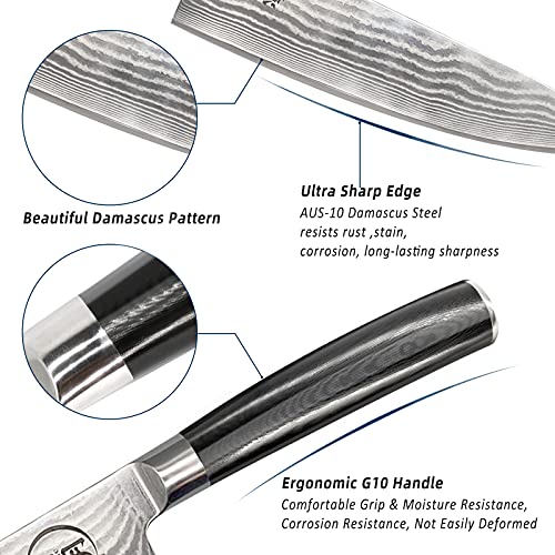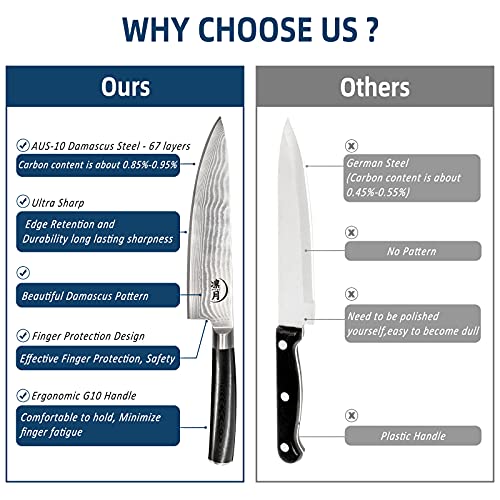 - High-quality Damascus steel: This HomLux Damascus chef knife is a professional kitchen knife, it made of ultra sharp AUS-10 Damascus high carbon steel with 67 layers, after Vacuum Heat Treated Japanese super steel cutting core and the Rockwell hardness can go up to 60±2 HRC. The Damascus steel contains about 0.85%-0.95% carbon, it makes the blade with high hardness and ability of resists rust, stain, corrosion, and long-lasting sharpness and it has enough durability and extraordinary performance.