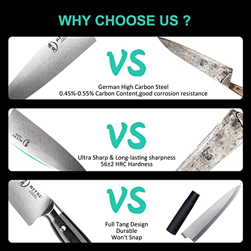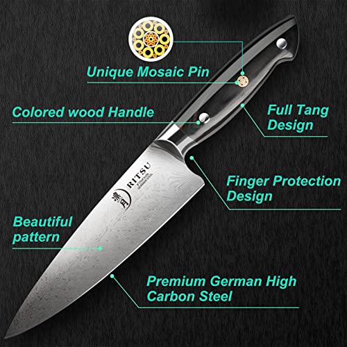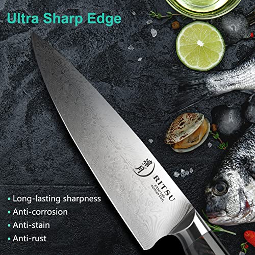 - 【Professional Kitchen Chef's Knife】RITSU Chef Knife, which is made of premium German Steel, with the characteristics of rust-proof, stain-proof, and corrosion-proof, the blade edge with high hardness but not easy broken. This Kitchen knife can be used for your daily kitchen tasks of chopping, slicing, dicing, and mincing all kinds of meat, vegetables, fruits, and bread and also cuts meat off bones.