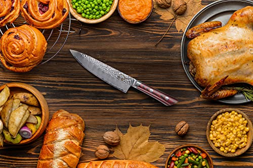 - 🔪【Multi-functional Chef's Knife】Our Chefs Knife can easily meet all your daily kitchen needed such as chopping, slicing, dicing and mincing for meat, vegetables, fruits, bread and also cuts meat off bones. What's more, the damascus steel blade not only comes with beautiful damascus pattern, greatly increase the aesthetics, but also with Hand forged hammered texture that can anti-sticking foods, make you more effectively to finish your daily kitchen cutting task.
