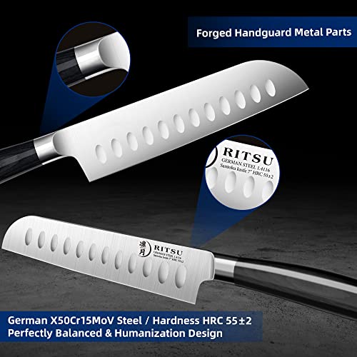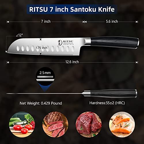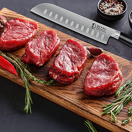 Details: RITSU PROFESSIONAL MULTI-FUNCTIONAL SANTOKU KNIFE YOU ALWAYS NEED ! RITSU santoku knife is made of premium X50Cr15MoV German High Carbon Stainless Steel, the carbon content in the steel is about 0.45%-0.55%, it makes the blade with better hardness and ability of resists rust ,stain and corrosion. This japanese chef knife can work perfectly on chopping, slicing, dicing and mincing meat, vegetables, fruits, bread and also cuts meat off bones, brings you an effective cutting experience. Very suitable for both home and restaurant kitchens. Specification: Weight: About 0.43 pound Knife Total Length: 12.6 inch Blade Length: 7 inch inch Blade Height: 1.75 inch Blade thickness: 2.5 mm Handle Material: Black Colorwood Handle Blade Material: X50Cr15MoV German High Carbon Steel Feature: ▶Durable Knife Blade: ·Adopt premium X50Cr15MoV German High Carbon Stainless Steel with cutting core at 55±2 Rockwell hardness. ·The round hole pattern design not only increases the aesthetics, but also prevents the meat from sticking on the blade, which maximizes the slicing efficiency. ·Excellent craftsmanship, advanced forging technology and high-quality materials. ▶Ergonomic Black Colorwood Handle: Ergonomic black colorwood Handle, which is non-slip, moisture-proof, good stability and is not easy to deform. What’s more, Ergonomic design that keep the well balance and minimized finger fatigue. ▶Ultra Sharp Edge: Ultra Sharp Blade Edge can let you cutting effortlessly and get the job done efficiently. The blade is forged by vacuum heat treatment and nitrogen low temperature tempering that make it very durable, wear resistant and not easily deformed.