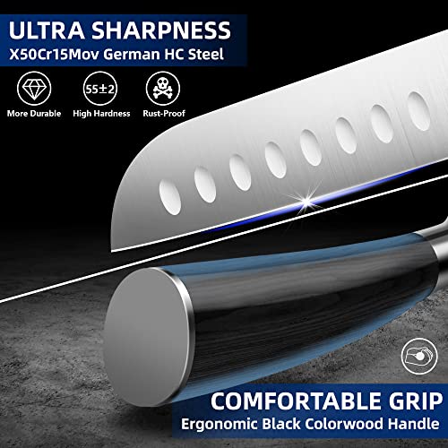 - 【Multifunctional Santoku Knife】The circular hole concave pattern designed on the blade not only improves the aesthetics, but also reduces the cutting resistance and prevents the meat from sticking to the blade. This professional chef's knife easily handles your everyday kitchen tasks like chopping, slicing, chopping, chopping fruits, vegetables and a variety of meats including fish, chicken and beef. It is truly an all-rounder cooking knife and the first choice of home cooks and professionals alike.